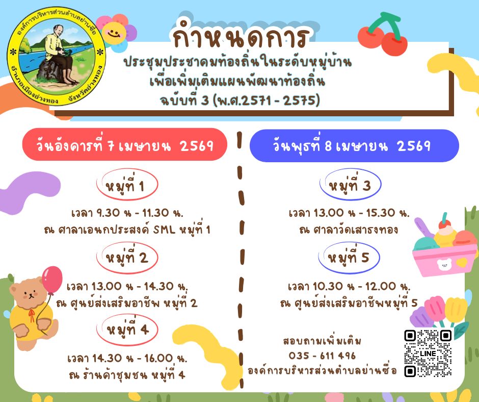 - จัดการประชุมประชาคมตำบล เพื่อรับฟังความคิดเห็นของประชาชน 2 เรื่อง , 19 มีนาคม 2569