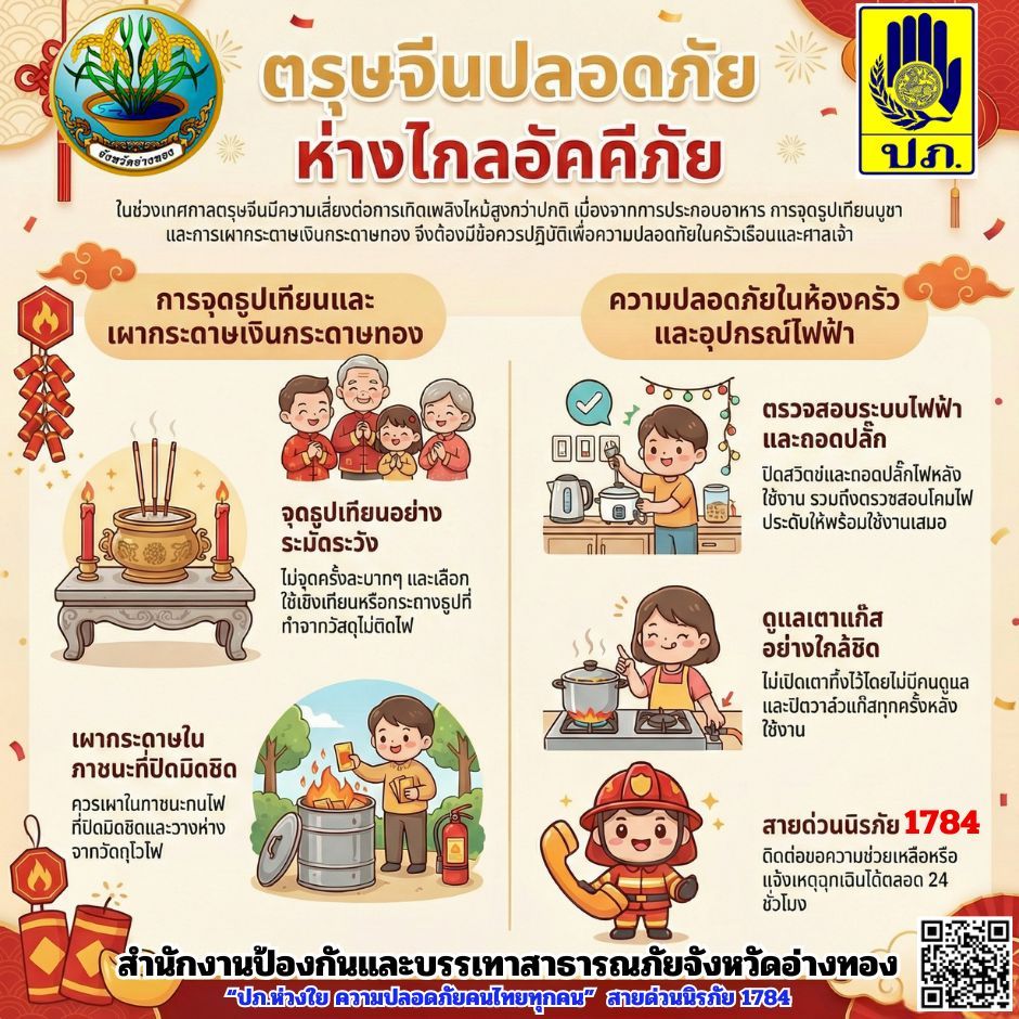จังหวัดอ่างทอง #เข้มงวดมาตรการเฝ้าระวังและป้องกันการเกิดอัคคีภัยและอุบัติภัยในช่วงเทศกาลตรุษจีน ในช่วงวันที่ 15 – 17 กุมภาพันธ์ 2569 เพื่อสร้างความปลอดภัยและลดความสูญเสียต่อชีวิตและทรัพย์สินของประชาชน